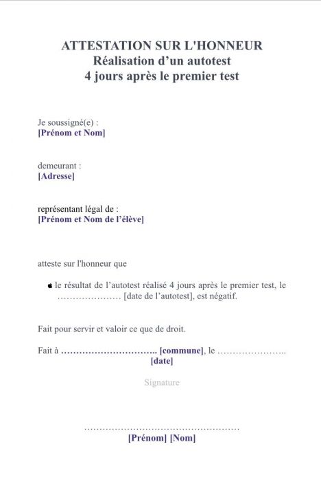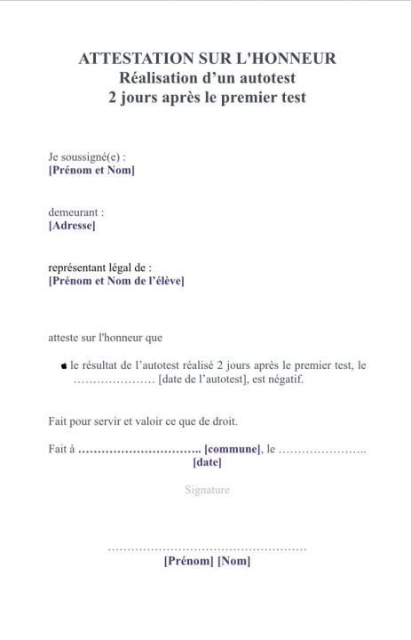Vous devrez ensuite fournir une déclaration sur l'honneur à J+2 et J+4 comme quoi vous avez bien effectué un autotest négatif aux dates requises ( ils vous seront fournis par la pharmacie après le 1er test).
