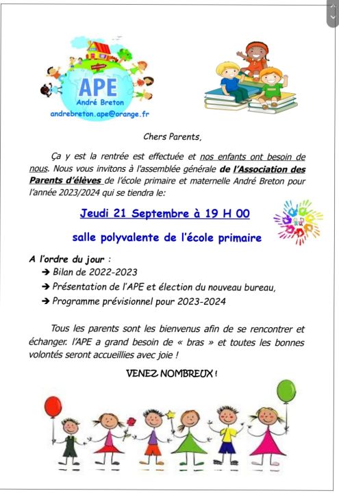 La rentrée est effectuée, l'APE vous invite jeudi 21 septembre à 19 h00 dans la salle polyvalente de l'école primaire pour l'Assemblée Générale.